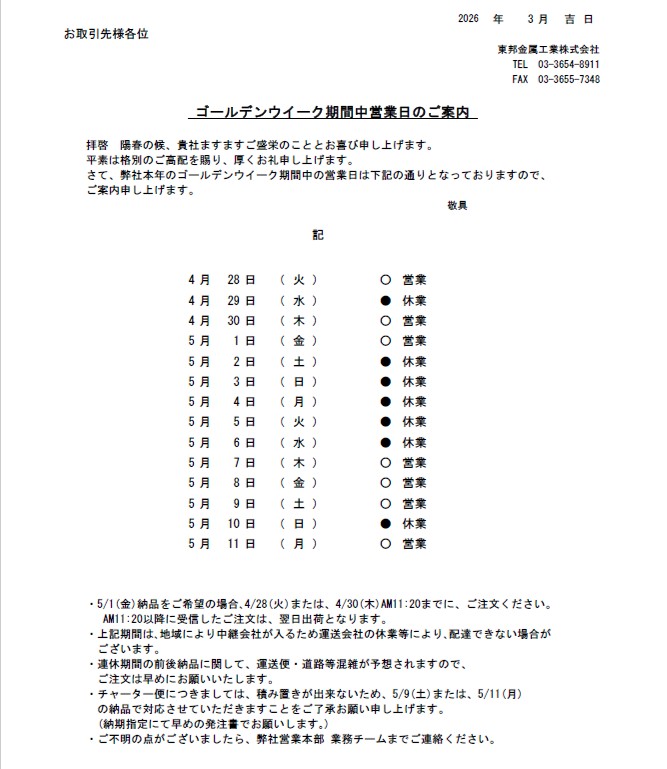 2026年ゴールデンウイーク期間営業日のご案内